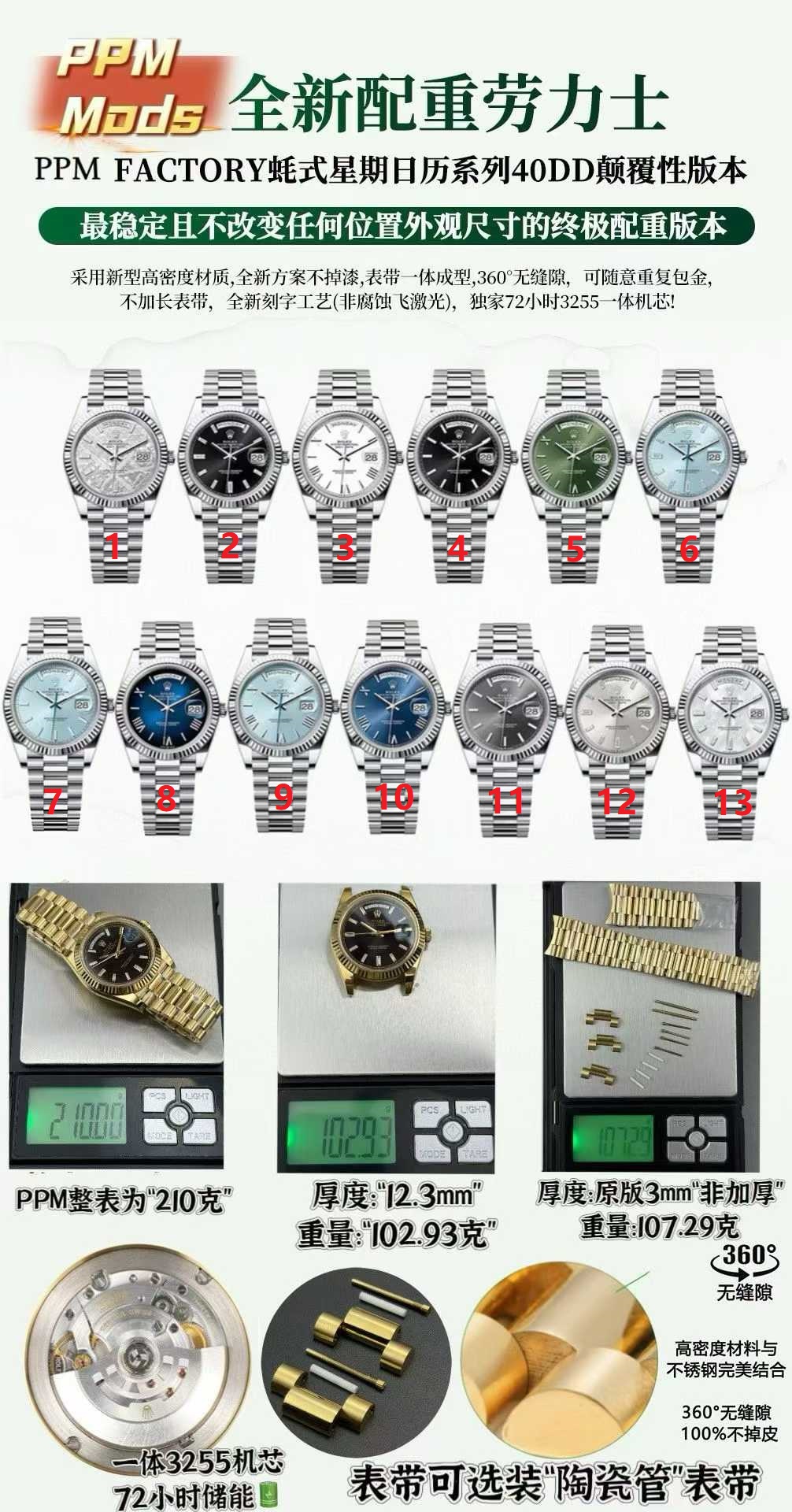 PPM 228238 Day-Date Weighted About 210gMOVEMENT:Asian Super Clone 3255 Automatic Movement At 28800VPH ,Same Structure As Gen,72 Hour Power Reser..
